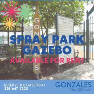 The Jambalaya Park Spray Park is free to the public. The Spray Park is open Tuesday-Sundays from 8:00 AM-8:00 PM. The Spray Park is closed on Mondays. There are two gazebos: one for public use and one for private rental. For Gazebo rentals, please contact the Department of Community Services or fill out this booking link: City of Gonzales Rentals.