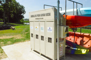 Kayakers can now rent a kayak from a self-serve kiosk located behind the pool at the park, or bring their own kayak and equipment and enter the launch.